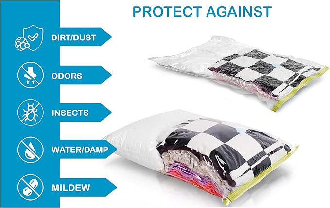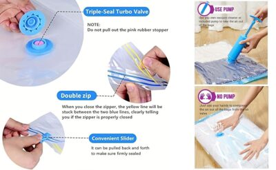 - AIRTIGHT, LEAK-PROOF DESIGN – Double-zip seal + triple-seal turbo valve keeps air out and items protected from moisture, dust, odour and insects ideal for long-term storage.