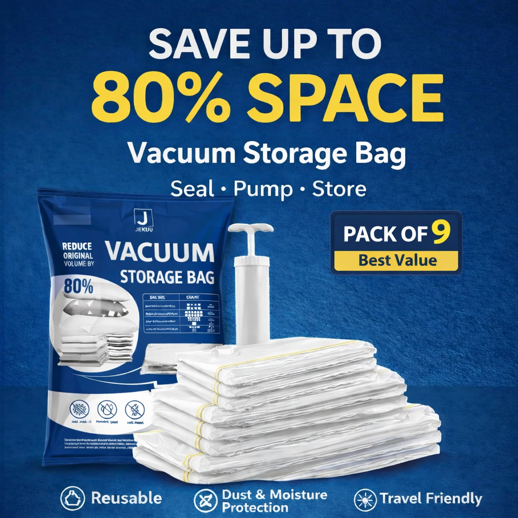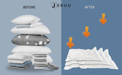 Using the JEKUU Vacuum Storage Bags | 3 Medium (50×70), 3 Large (60×80), 3 Jumbo (76×100) with Hand Pump are the long-term storage solutions to the minimum possible size. For different seasons, you can use vacuum storage bags to reduce larger and fluffier articles of clothing like vests and winter coats to their minimum possible size saving your space of wardrobe.