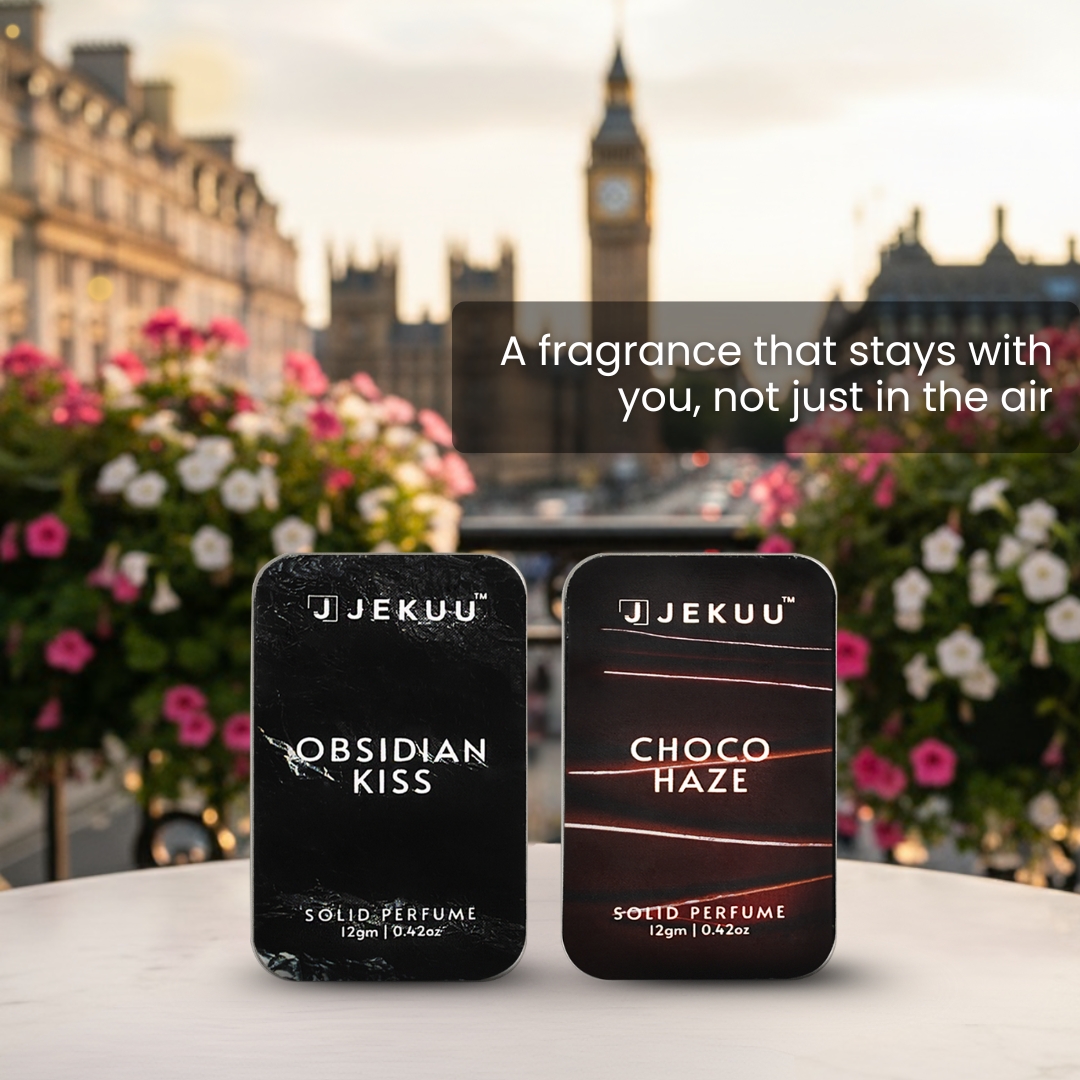 Indulge in a bold and irresistible fragrance experience with the JEKUU Solid Perfume Combo – Obsidian Kiss & Choco Haze. This luxurious duo blends deep musky woods with rich chocolate warmth, creating a scent that is both seductive and comforting.