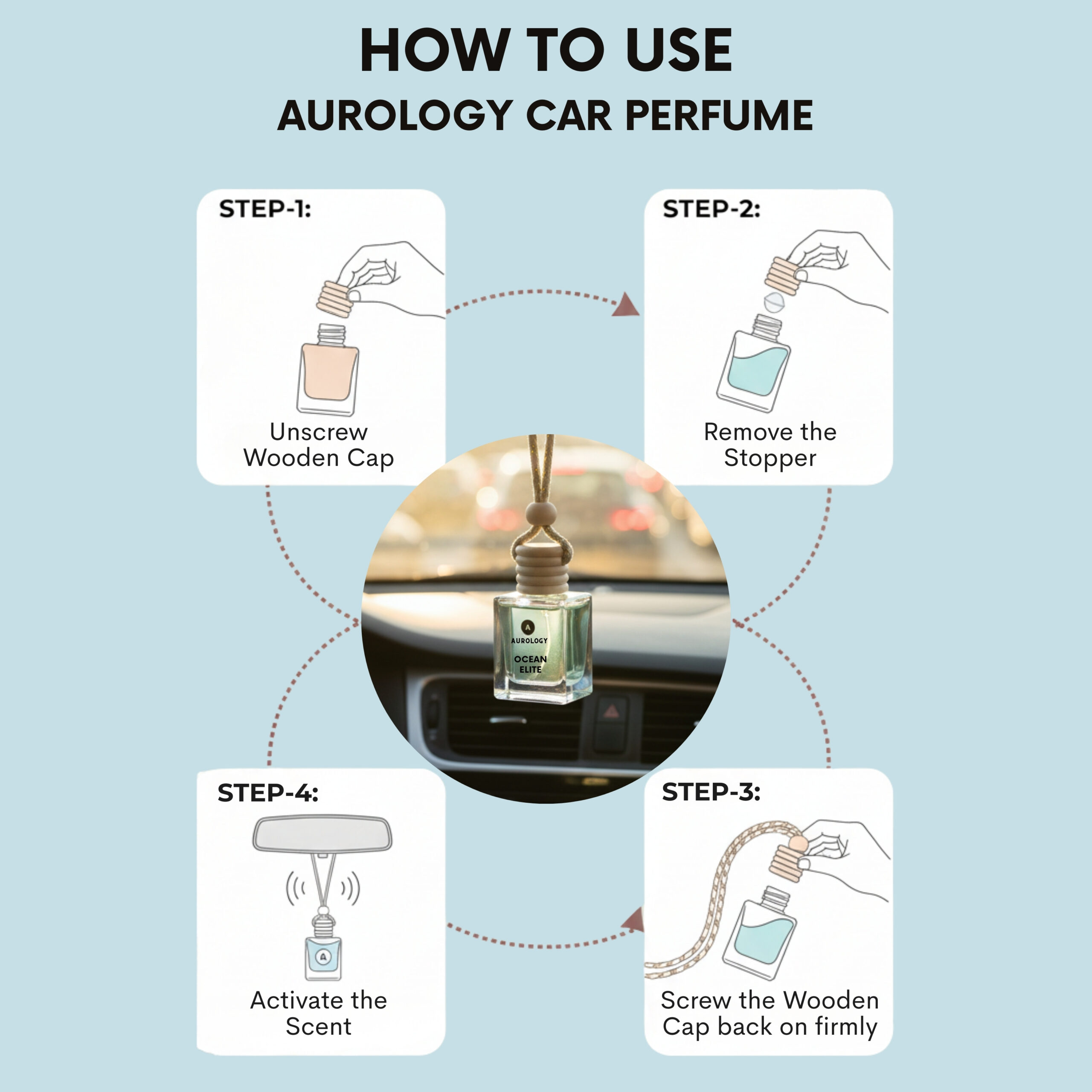 - How to Use: Take off the wooden lid and remove the plastic cap, then put the wooden lid back on. Turn the bottle upside down for 10–15 seconds so the lid gets soaked with oil. Hang it on your rear-view mirror using the thread. Repeat once a week.