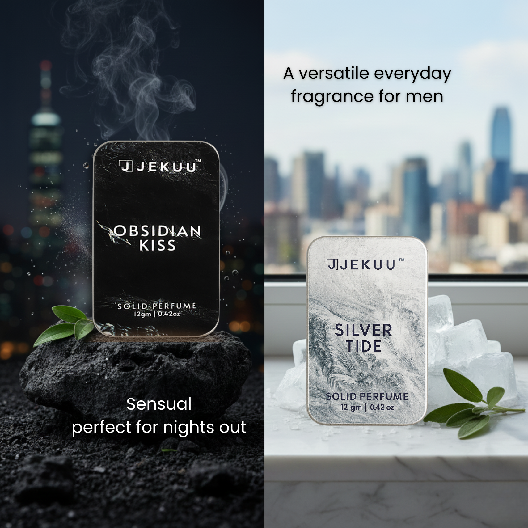 Experience the art of fragrance through two contrasting yet perfectly balanced scents. This exclusive duo features Silver Tide, a refreshing aquatic blend inspired by crisp ocean breezes and sea salt, paired with Obsidian Kiss, a bold and sensual fusion of dark musk, leather, and warm spices. Handcrafted in the UK, these alcohol-free solid perfumes are designed to be gentle on the skin while providing a long-lasting, intimate scent profile. Whether you need a clean, energetic lift for the morning or a deep, mysterious intensity for the evening, the JEKUU duo offers the modern man a complete fragrance wardrobe in one compact, travel-friendly set.