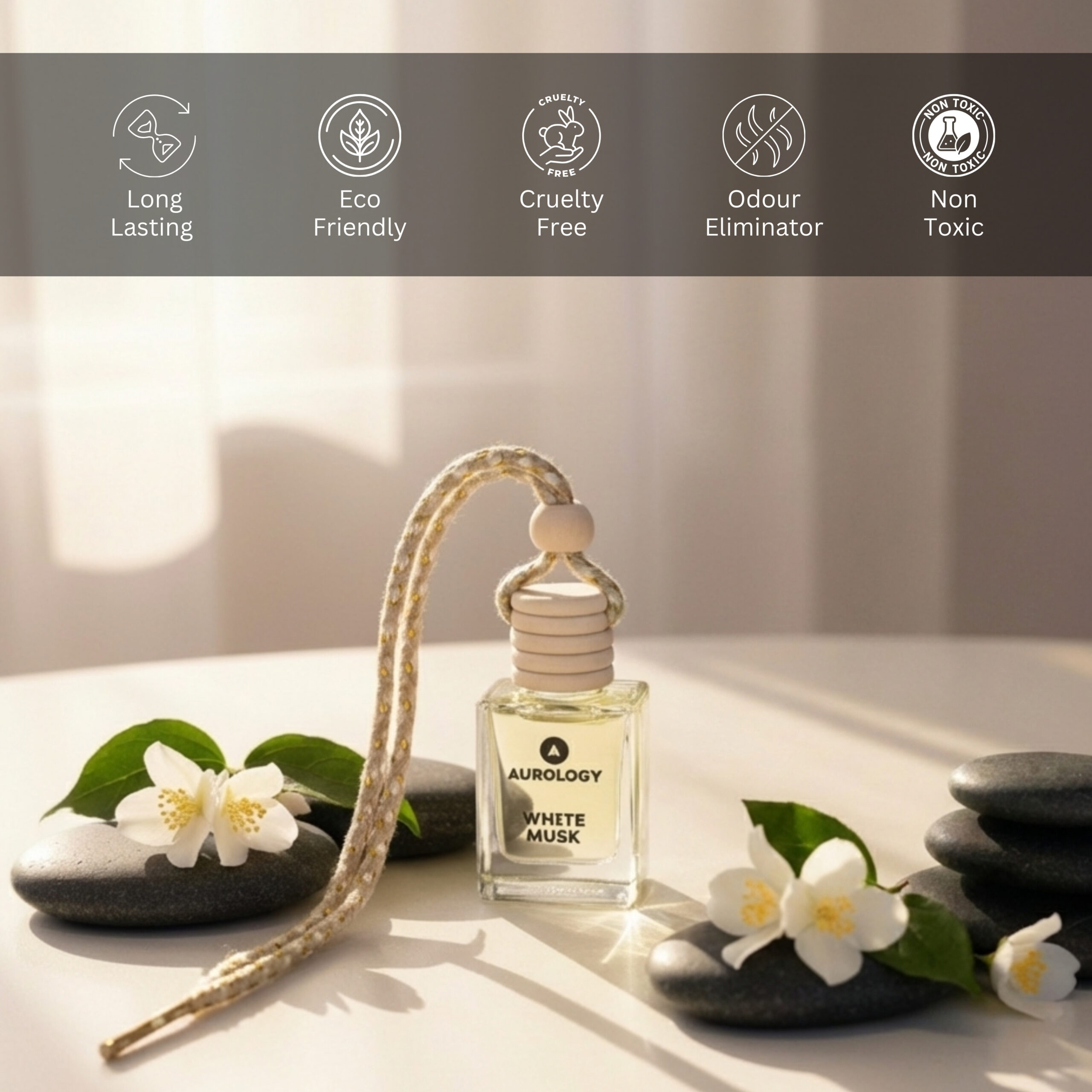 Enhance every journey with Aurology Car Hanging Perfume. Designed with natural essential oils, this premium car air freshener provides a long-lasting fragrance up to 45 days, neutralizing smoke, food smells, sweat, and damp odors. The delicate White Musk fragrance creates a calming, elegant ambiance inside your car. Its elegant glass bottle with a wooden diffuser top ensures a slow, consistent release of aroma, while adding a premium look to your interior. Easy to hang on your rear-view mirror, this car hanging perfume is both a functional air freshener and a stylish car accessory. Ideal for daily commutes, long drives, or gifting, it transforms your car into a clean, refreshing, and inviting space.