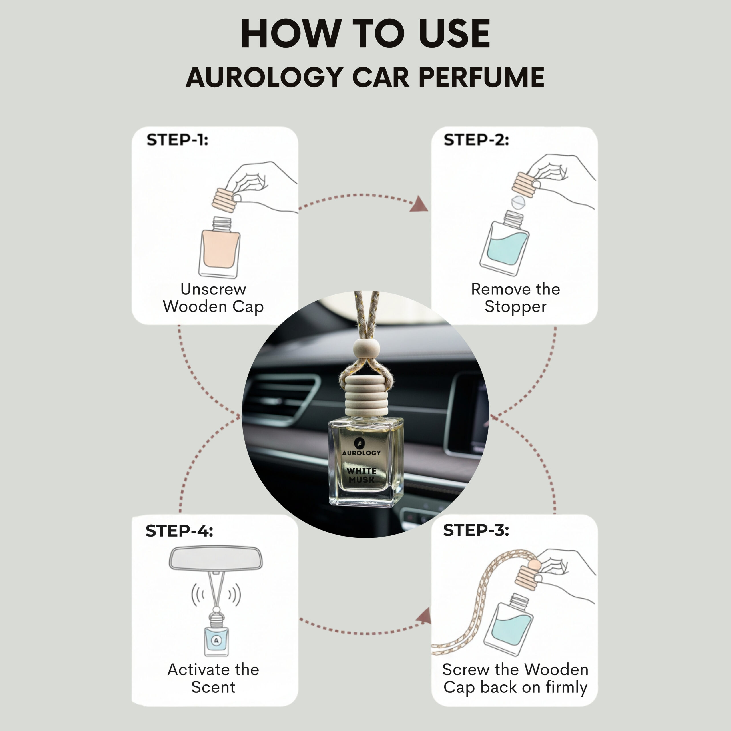 - How to Use: Take off the wooden lid and remove the plastic cap, then put the wooden lid back on. Turn the bottle upside down for 10–15 seconds so the lid gets soaked with oil. Hang it on your rear-view mirror using the thread. Repeat once a week.
